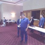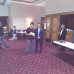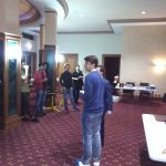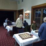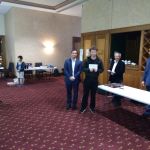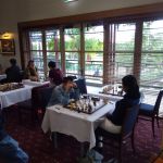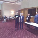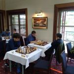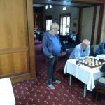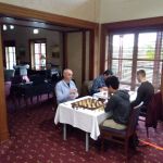 IM (and now GM-elect) Temur Kuybokarov being presented with the trophy for winning the Gold Coast Open 2018 by tournament organiser Andrew Fitzpatrick.  Arbiters IA Peter Tsai and FA Shaun Curtis are looking on and FA Michael D’Arcy has the camera.